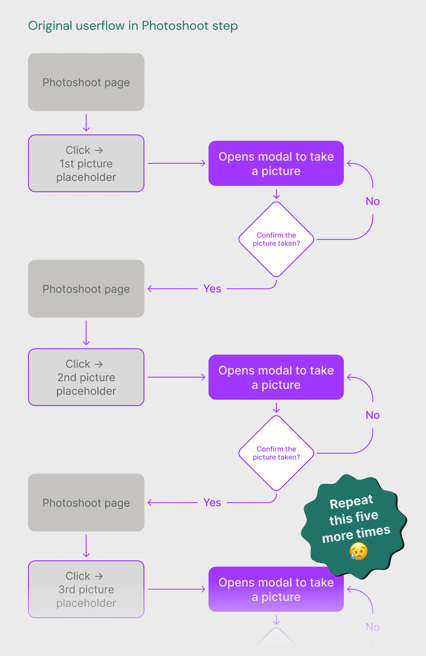 Users define the internal flow of the Photoshoot step as "very clogged", "not very smooth" and "very slow".